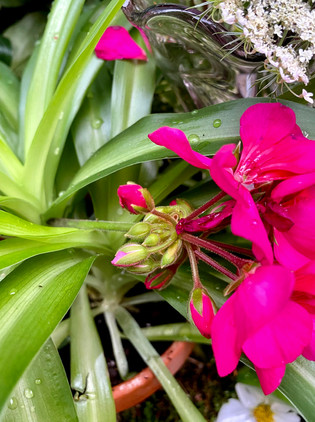 Following the upward climb’s peak is a steep yet blissful descent into a terracotta pot containing the original pink cosmos plant alongside a second taller, heartier, cosmos with multiple flowers and buds in a rich deep pink-purple color. The latter is growing tall and secure towards the sunlight.